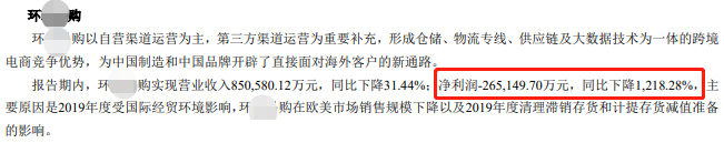 账面上,环XX购母公司2019年巨亏27.08亿元,其中环XX购亏损达26.5亿。究其原因,受2019年受国际经贸环境影响,跨境出口业务遭遇冲击,环XX购在欧美市场销售业务也出现了下滑。