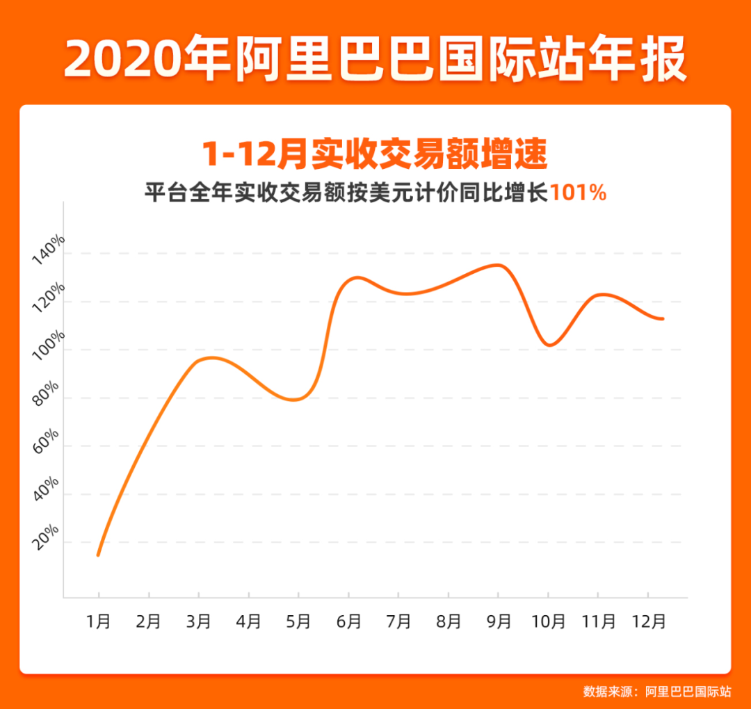 阿里巴巴国际站发布2020年全年年报,平台实收交易额按美元计价同比增长101%,订单数同比增长翻番,数字化新外贸助力中国商家逆风翻盘。