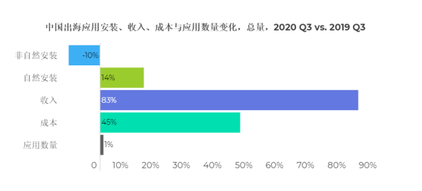 从最早的“工具出海”,到电商、游戏、小说漫画、以及泛娱乐类应用。出海应用品类越来越丰富。截止到 2020 年第三季度,中国出海应用在数量上与去年保持相当,增长 1%,总体营收年度增长83%,买量成本在过去一年攀升了 45%,非自然安装量同比下滑 10%。
