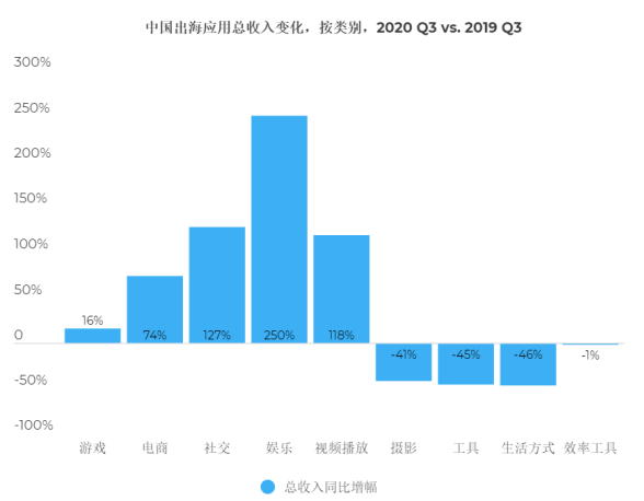 与2019年相比,中国出海应用出海变化巨大,其中娱乐、社交、视频类收入剧增,而工具、摄影类的应用收入则减少很多。