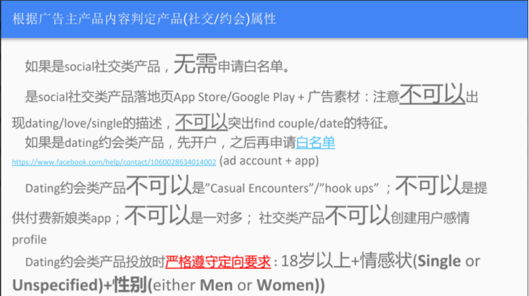 很多应用在买量的时候就会遇到问题,有些应用想要投放广告需要开通白名单,如社交类App如果带有约会属性的话就要开白名单,如果没有开通白名单,就不允许投广告,必须讲产品内带有约会元素的功能都去除,否则一旦上线发生违规,App就会被Facebook拉黑。想要知道怎样看自己App是社交还是约会,可以参考下图。