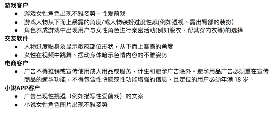广告不得包含成人内容,包括展示裸体、暗示或赤裸地描述性爱姿势,以及属于过分性暗示或性挑逗的活动。