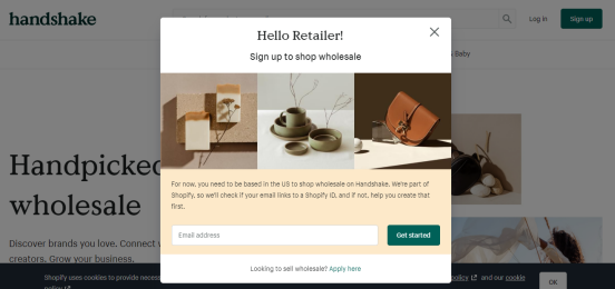 值得注意的是,在登陆Handshake网站时,会出现一个明显的提示:在该网站采购商品的零售商,必须位于美国,且必须拥有Shopify账号。也就是说,Handshake目前只服务于使用Shopify开店的美国商家。