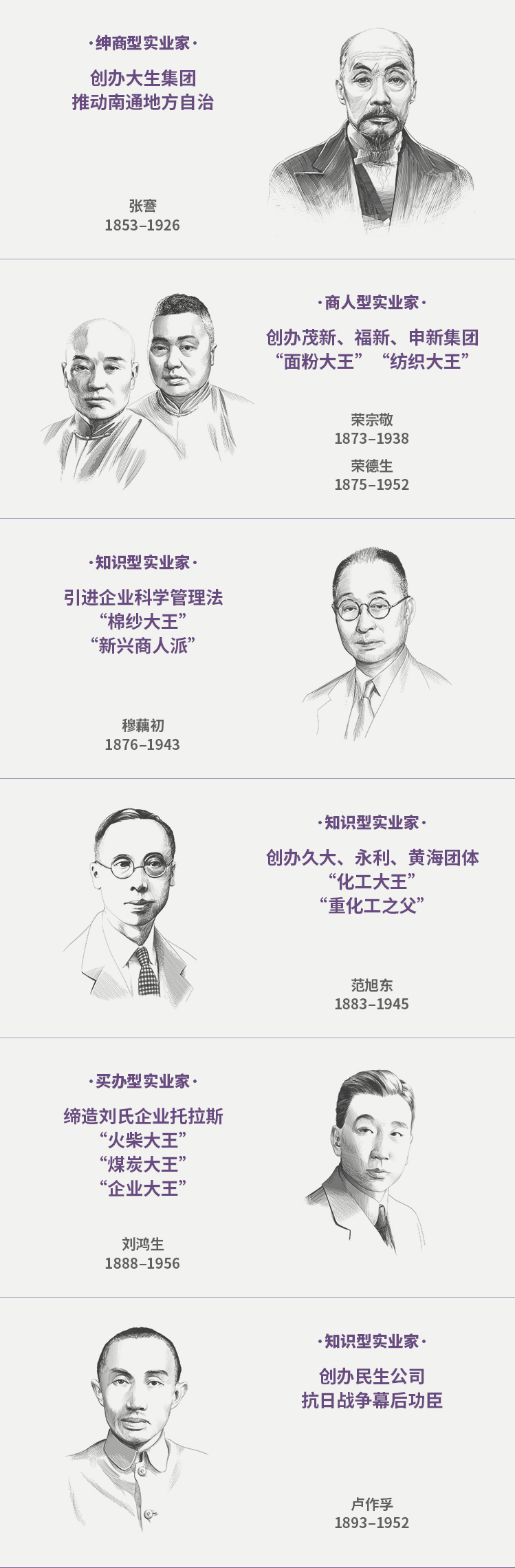 一幅近代企业家的群像在我心里变得越来越清晰,由他们各具个性特色的努力所构成的本土企业传统也渐渐在我眼前浮动。这个独特传统的内核就是实业救国,我的“大商人”系列选择了张謇、荣氏兄弟、穆藕初、范旭东、刘鸿生、卢作孚,他们都是近代以来实业救国的代表人物。