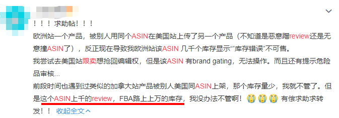 无独有偶,在微博上,侃哥发现也有亚马逊卖家遭遇了相同的恶搞,导致其还有几千个库存的产品变为不可售。更为严重的是,据受害者称被搞的ASIN有上千的Reivew,发往FBA的路上还有上万件货!卖家曾尝试去美国站跟卖想抢回编辑权,但是该ASIN有brand gating,无法操作,而且还提示危险品审核...万般无奈之下,受害卖家在微博上有偿求助。
