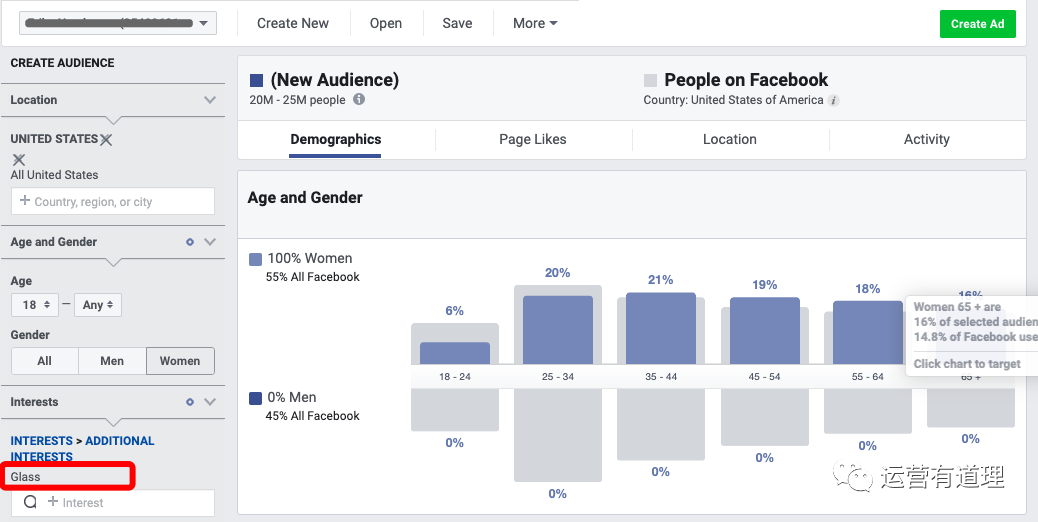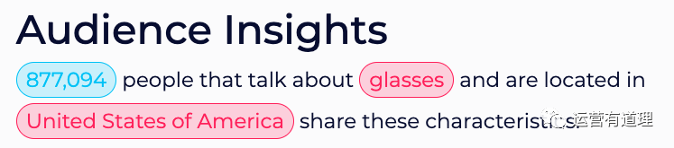 这是FB官方的免费工具,如下图,输入insterest后(比如我们输入glass),后即可分析出对glass感兴趣的群体的客户画像。