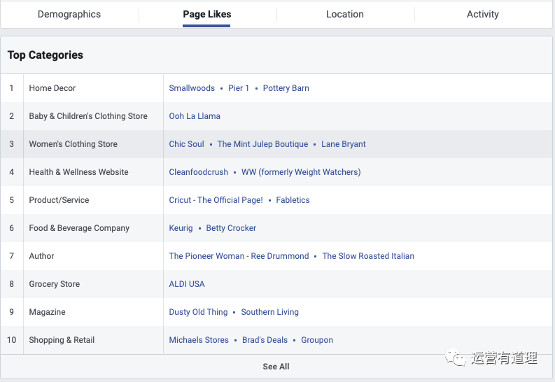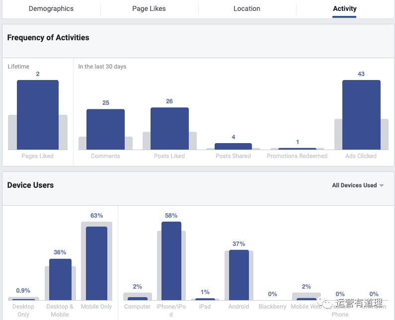 可以分析出年龄,性别、情感状态、教育水平、一般的职业、喜欢的品类、page likes、top国家城市和语言、经常的互动行为、设备情况