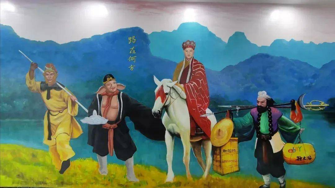 这么大的一个场地,光装修费就花了两三百万,每月租金与维护大概要10万左右的费用。装修的壁画也特别讲究,画的是西游记唐僧师徒四人向西取经的途中,寓意着跨境电商从业者也在取经(金)的漫漫长路上。