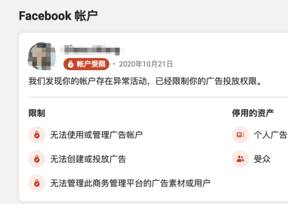 如果Facebook在帐户中发现可疑或违规行为,例如规避审核流程或反复因违反政策而使广告帐户和其他广告资产遭到禁用,那么Facebook会限制广告功能的使用。