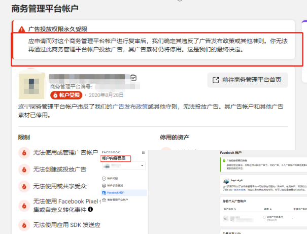 Facebook广告受限指的是广告功能的投放受限,不是我们常说的我的Facebook广告投放不出去,他会反映在你的Facebook个人账户、公共主页、BM上,如下图所示: