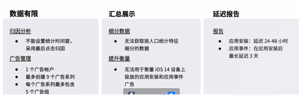Facebook将使用Apple的SKAdNetwork API在iOS 14设备上投放应用广告,届时所有应用事件(App Event)数据将汇总展示并延迟报告。影响主要分为以下3个部分。