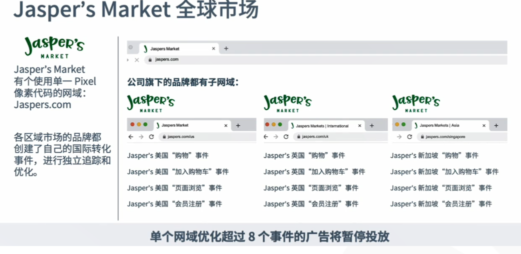 以下图Jaspers公司为例,如果广告主网域设置如品牌(.)地区,则每个网域可以单独被验证,每个网域可各自设置最多8个事件;如果广告主网域设置如其他两个例子,则所有网域被整合定义为一个网域,总共只能设置8个优化事件。