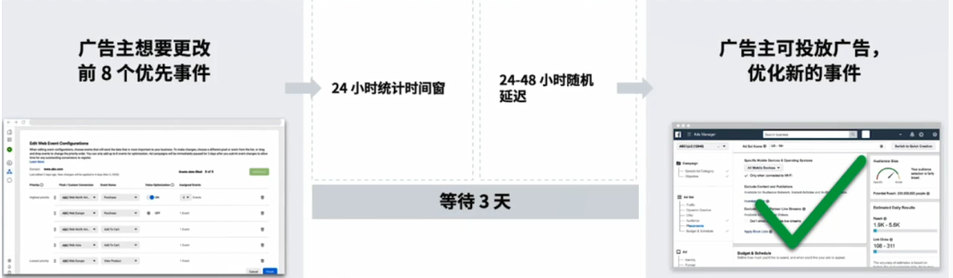 由于数据延迟,广告主(从8个事件中)选择新的事件或更改时间配置时,最长要延长3天才能优化该事件。