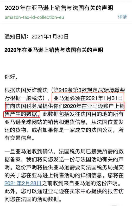 亚马逊在声明中表示,根据法国反欺诈法,亚马逊必须在2021年1月31日前向法国税务机关提供卖家2020年在亚马逊账户上销售产生的数据。一旦亚马逊收到确认,法国税务局已接受所需的数据备案,亚马逊将向卖家发送一份与法国活动有关的声明。这份声明将提供亚马逊需要向法国税务局提交的关于卖家在亚马逊上销售的详细信息。卖家将在2021年2月28日之前收到来自亚马逊的这份声明。