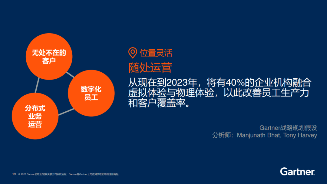 5、到2023年末,40%的企业机构将通过随处运营提供经过优化与混合的虚拟/物理客户与员工体验。