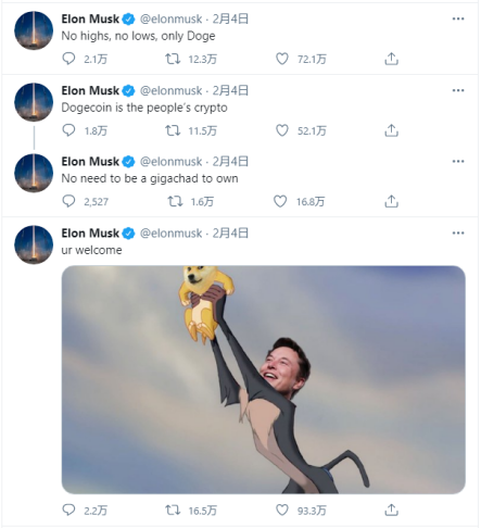 最近的例子是狗狗币。2月4日,马斯克连发多条推特力挺虚拟货币狗狗币(Dogecoin)。在过去两年,马斯克至少五次在推特上推荐狗狗币,还曾自称“狗狗币前 CEO”,但这一次粉丝和资本市场却给出了前所未有的反应。