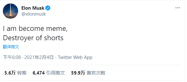 这也让马斯克在美国散户中建立了巨大的威望,甚至成为多头的风向标。就像马斯克在推特上感慨的那样,自己成为了一种新的文化,成为空头的毁灭者。