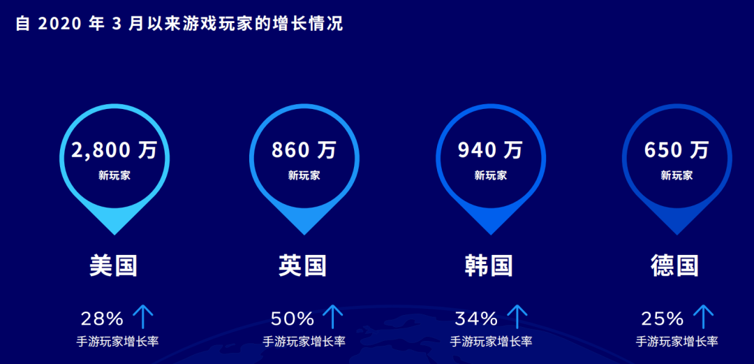 随着居家隔离和保持社交距离等措施的实行,人们都在寻找新的娱乐方式,游戏行业也因此迎来一大批新玩家。自 2020 年 3 月以来,美国、英国、韩国、德国新玩家分别增长了2800万、860万、940万、650万,其中英国游戏新玩家的增长率达到50%!