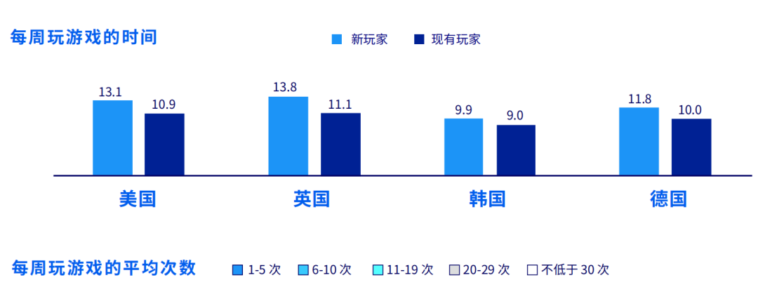 纵观所有市场,尽管新玩家与现有玩家每周玩游戏的平均次数相差无几,但在每周的游戏总时长上,新玩家还是现有玩家胜出一筹。