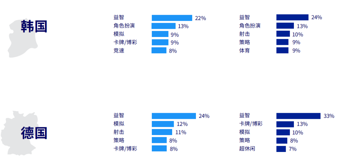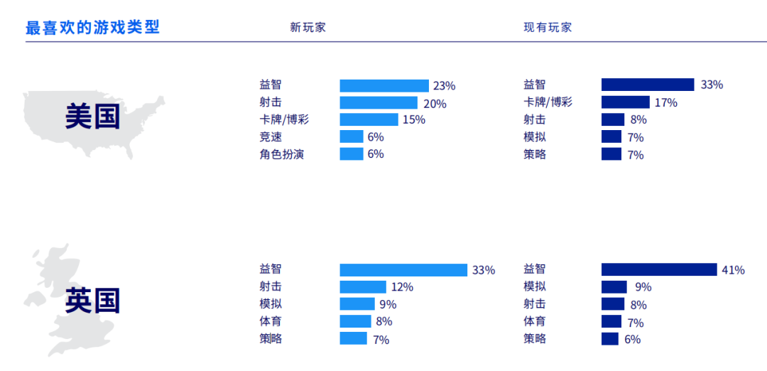 在美国和英国,新玩家明显比现有玩家更爱玩核心游戏,而在德国和韩国,两类玩家喜爱的游戏类型更为相近。