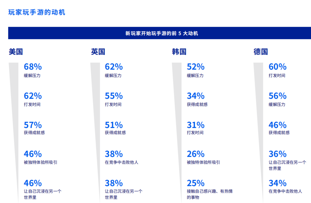 纵观所有市场,新玩家与现有玩家玩手游的动机都差不多。缓解压力、打发时间以及获得成就感一直都是玩家 玩手游的前三大动机。