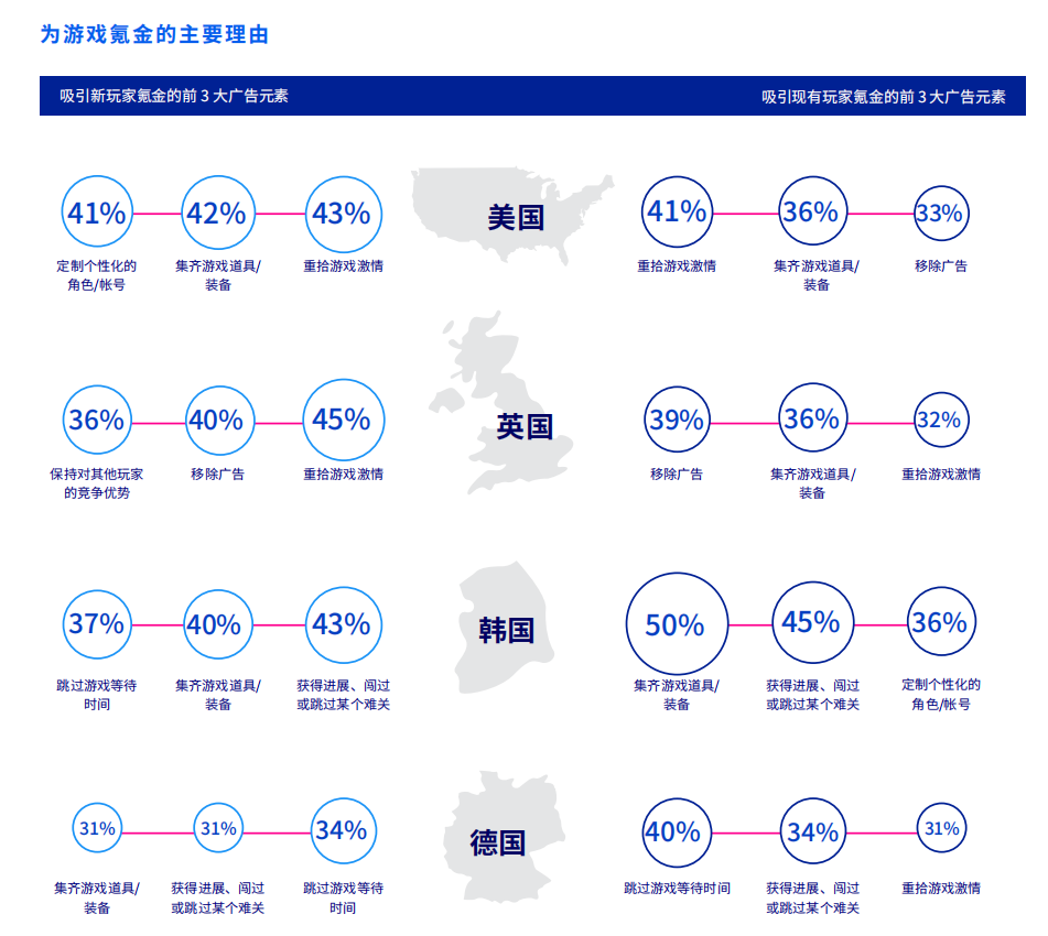 在所有市场中,新玩家在新冠疫情刚暴发后氪金玩手游的比例显著高于现有玩家。不仅如此,新玩家每月在手游上 的氪金额也要比现有玩家多。不过,在分析玩家氪金理由时,我们发现,不同市场间的差异要比新老玩家间的差异 更大,其中有些还与游戏类别有关。在美国和英国,玩家尤其愿意付费移除广告。而在韩国和德国,很多玩家则 表示愿意通过付费跳过等待或难关(这在益智游戏中更为普遍)。