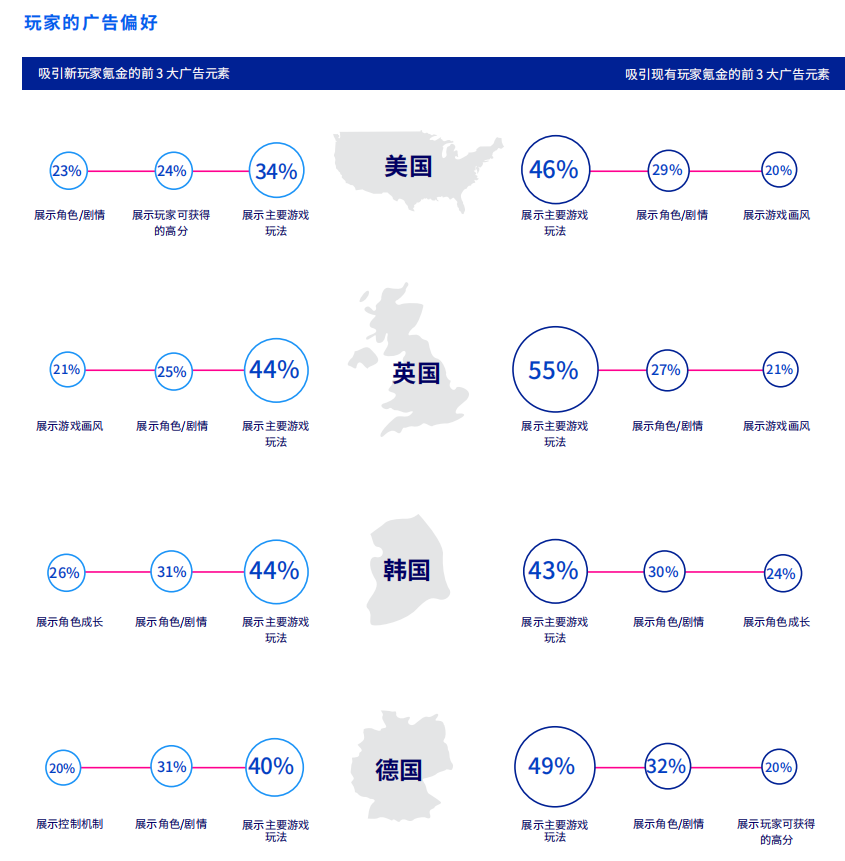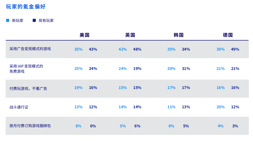 玩家愿意观看游戏中的广告。我们的调查也表明,所有市场的手游玩家普遍都表示更喜欢玩 采用广告变现模式的免费游戏。在美国、英国和德国,现有玩家比新玩家更乐意接受采用广告变现模式的游戏。而对于采用其他变现模式(例如应用内购买,简称 IAP)的游戏,新玩家的接受度要高于现有玩家。