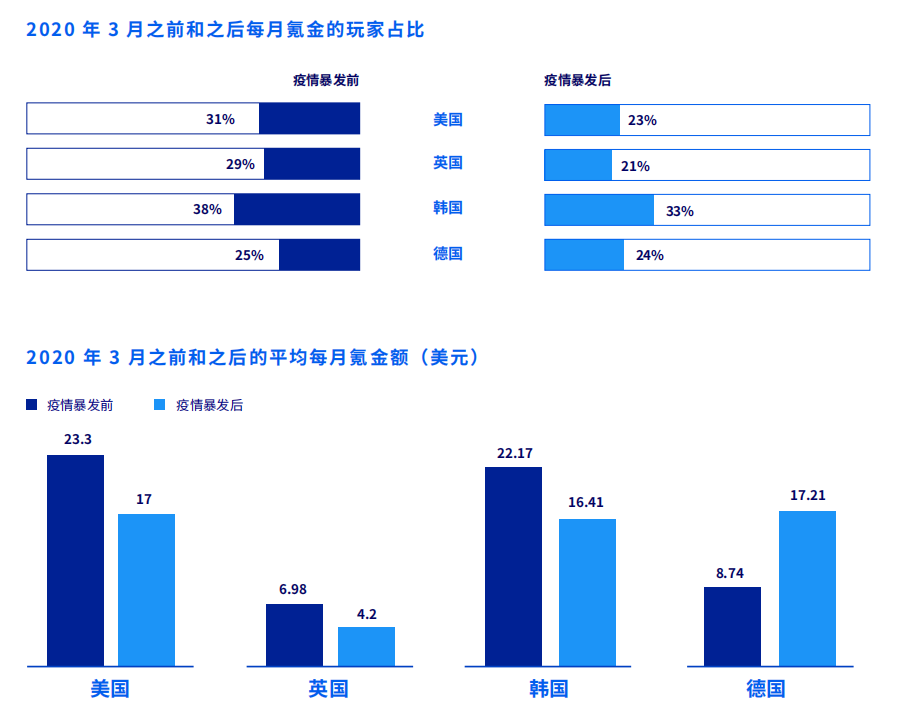 在美国、英国和韩国,表示疫情之前每月都会为游戏氪金的玩家占比更高。同样在这些市场,受访玩家表示在疫情暴发后减少了每月的氪金额。德国的情况则不同:表示疫情之前有氪金行为与表示疫情之后有此行为的受访玩家占比基本持平,事实上,疫情之后受访者每月的氪金额不降反增。