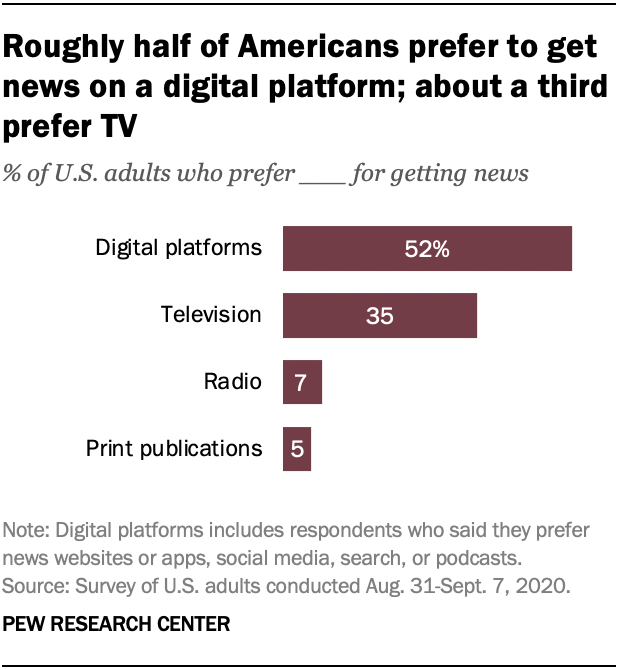 注:大约一半以上的美国人更喜欢借助数字平台来获取新闻,仍有约三分之一的人喜欢通过电视观看新闻 (来源:Pew Research Center)