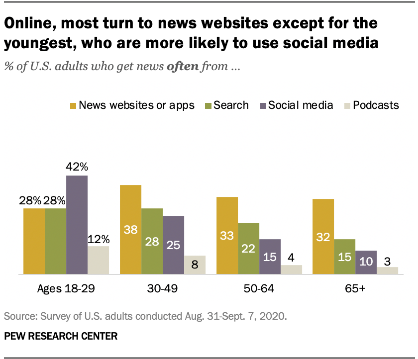 大多数年龄段的人(30岁以上的美国人)更喜欢通过专业的新闻网站与应用来了解新闻。