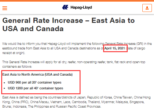 赫伯罗特官网3月12日发布通知,自2021年4月15日(date of cargo receipt at origin)起,将在从东亚到美国和加拿大所有目的地的东行航线实施以下GRI。