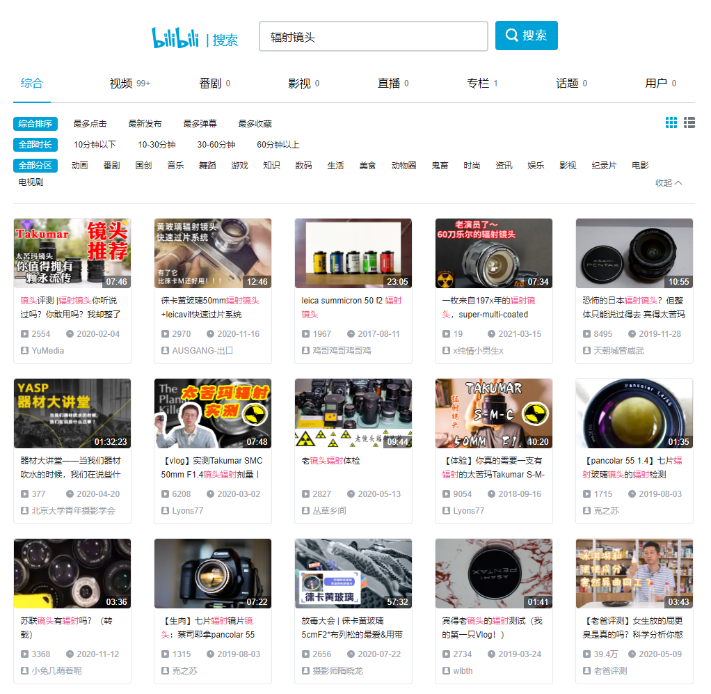 比如,搜索一个大家绝对不了解的东东“辐射镜头”。B站能搜到一大堆内容,真是让我这种镜头爱好者非常心水。(除了最后一个搜索结果不知所云之外……)