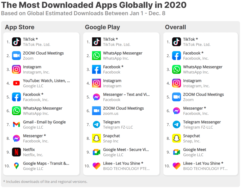 图注:2020年社交媒体下载量排行榜中,TikTok稳居首位,Snapchat位居第8(来源:Apptopia)