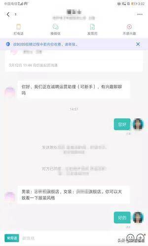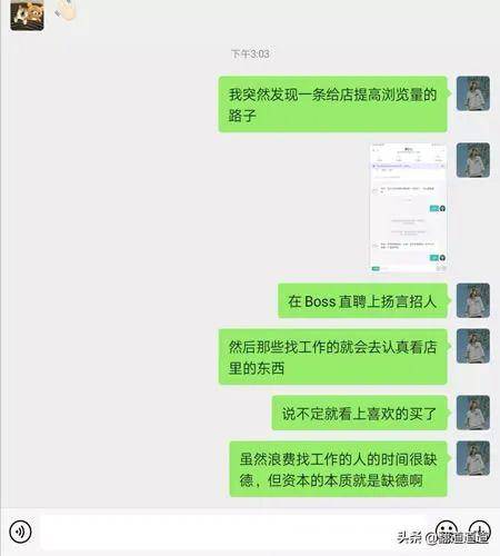 大意是:公司在BOSS直聘上发布招聘新人,求职者来咨询后,客服就用引导用户去淘宝搜索他的店铺,从而增加店铺的流量。如下图所示: