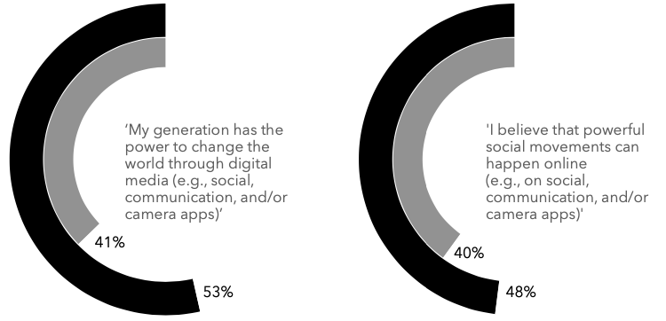 此外,不少Z世代用户表示,数字媒体与线上沟通平台增强了他们改变现实的热情与决心。在网络世界,他们找到与自己三观相符的伙伴,并加入这个兴趣社区。这种集体身份的确立有助于他们将想法付诸实践。53%的Snapchat用户认为可以通过在社交媒体的发声来推动变革。