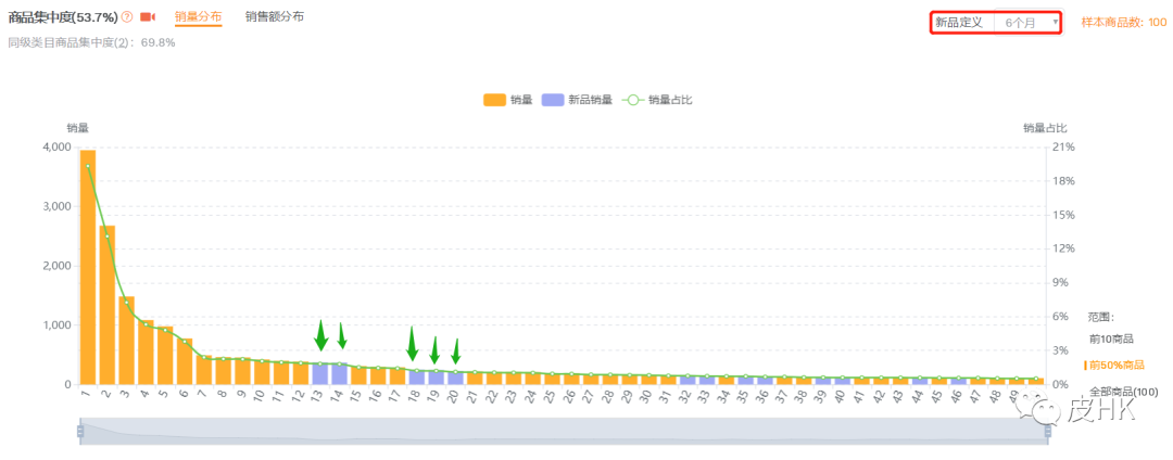 黄色柱子代表上架时间超过6个月的产品及其预估销量;
