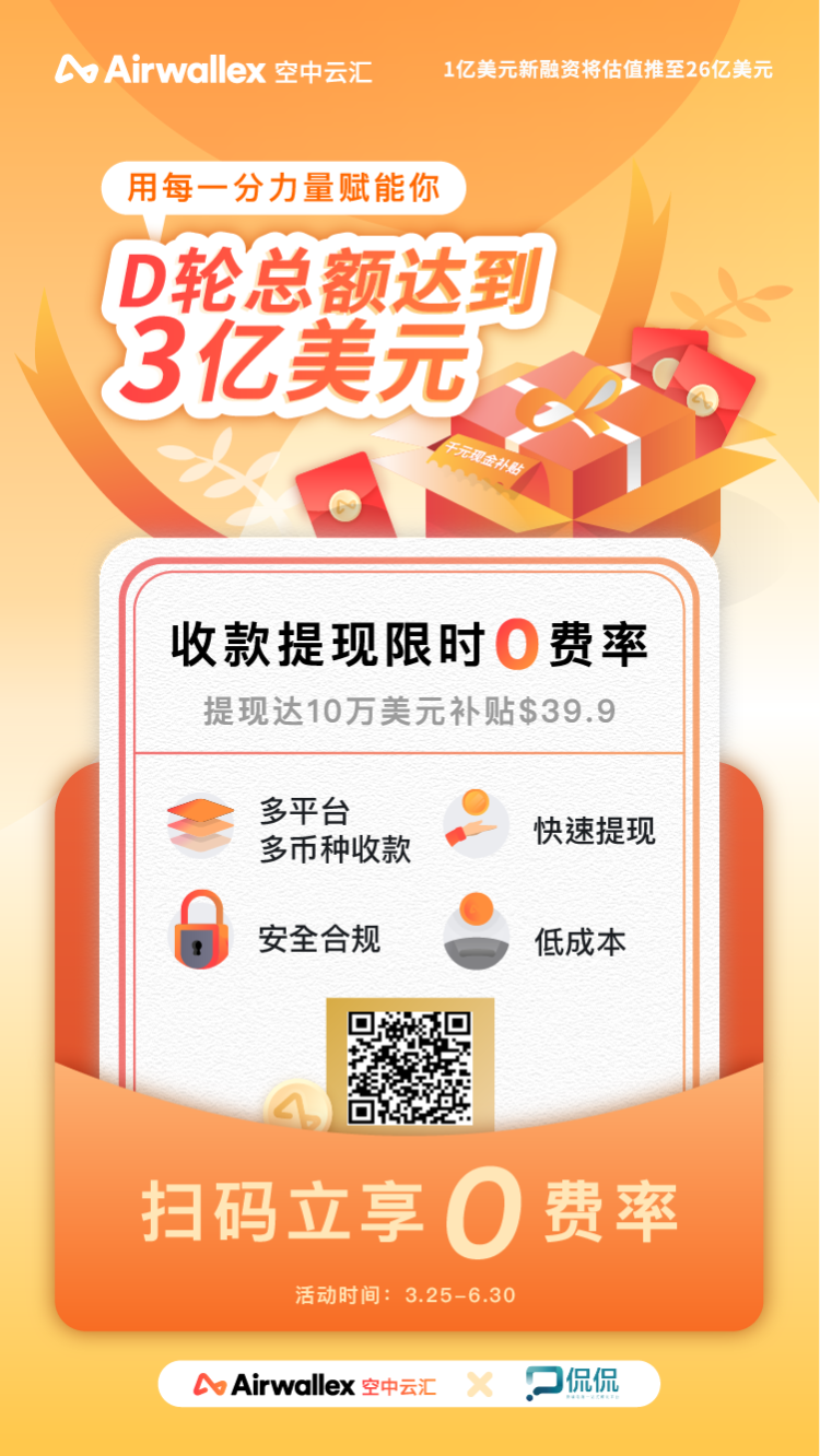近日,跨境支付领域“独角兽”Airwallex空中云汇官宣1亿美元新融资直接引爆跨境热搜榜。据悉,继去年4月的D轮和9月的D+轮,现D轮融资总额达到3亿美元,最新估值达到26亿美元。“风雨兼程,你只顾实现梦想,我为你固守后方。”获得大额融资后的Airwallex空中云汇再推出多项重磅福利回馈广大跨境用户。注意了!注意了!给跨境卖家送血包了!