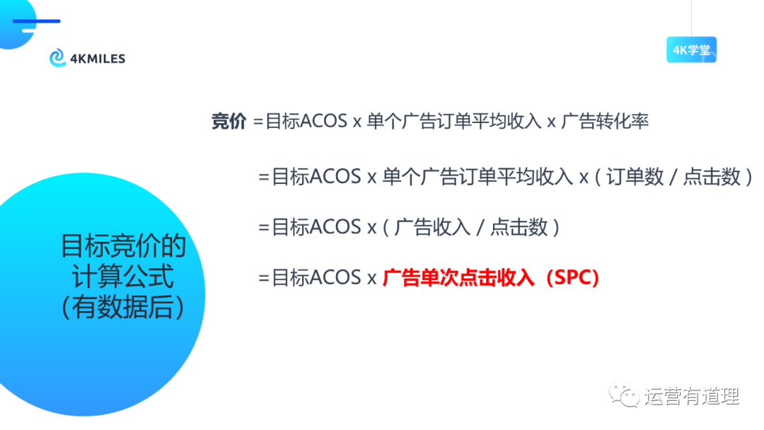 关键词竞价=(SPC*目标ACOS)/(1+ToS increase%*ToS click share)