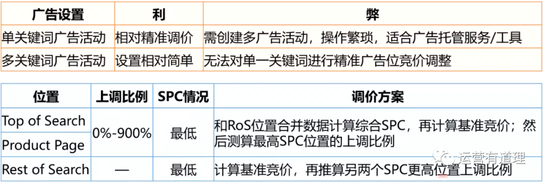 我们接着了解一下几种不同情况的调价思路。如果是单关键词广告活动,Rest of Search的SPC最低 ,那么我们可以直接算出Rest of Search的竞价或者是基准竞价是多少,然后再用SPC的比例去推算另外两个位置应该调整的比例。