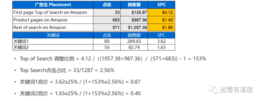 再假设有两个关键词,每个关键词对应的SPC等于销售额除以对应点击数,用SPC乘以设定的目标ACOS(这里设为25%),除以1+上调的比例乘以Top of Search点击的占比,计算出关键词1、2的出价分别可以调整到0.87、0.4。
