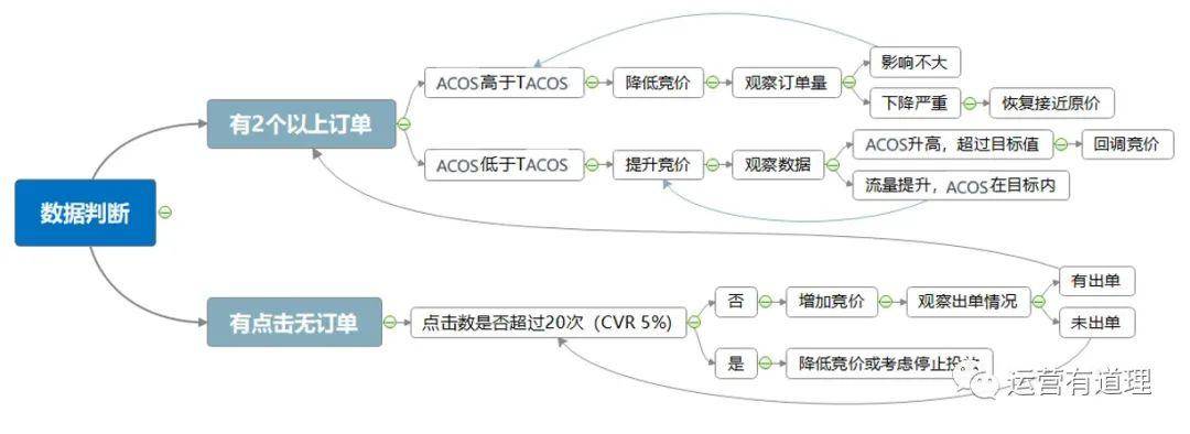 首先要拿到数据进行判断,由于单个订单存在偶然性,建议有两个订单以上再进行判断。需判断ACOS是否高于目标ACOS,如果高于则说明实际花费超过了期望占比,需要降低竞价,再观察整个订单变化,若对订单影响不大,证明成功控制ACOS,继续闭环进行调整,再次下调,直到达到目标ACOS为止。如果订单减少严重,建议恢复接近原价再做调整。