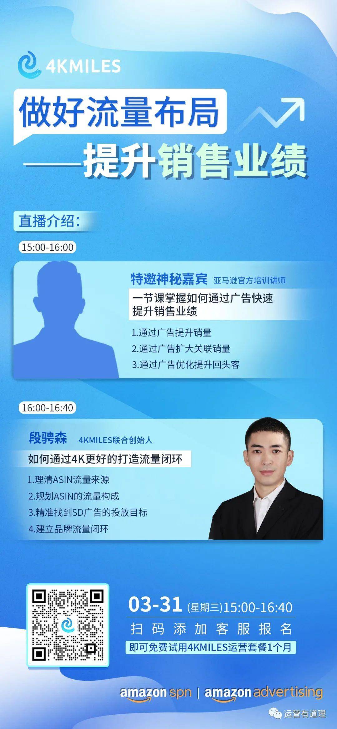 另外,报名参与直播的朋友都可以免费试用4KMILES运营套餐1个月哦!(扫描下方海报二维码添加客服即可报名)
