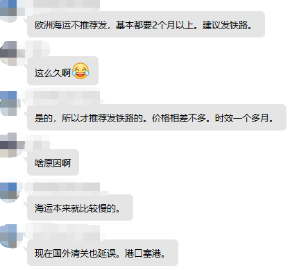 有货代表示,海运本来就比较慢,如今又加上国外清关、港口堵塞,导致货物延误情况更加严重。对此,他认为,不推荐卖家发欧洲海运,时效基本上要2个月以上,就价格成本差不多的情况之下,更建议卖家选择走铁路,因为铁路时效在一个多月。