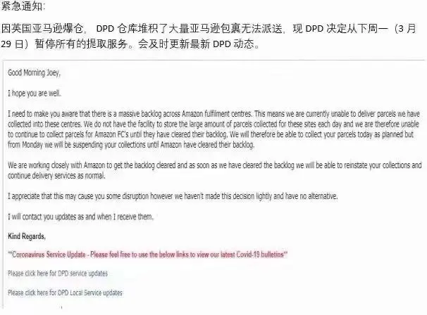 DOD仓库堆积大量包裹不少货代接到英国清关代理通知,由于亚马逊爆仓,导致英国DPD仓库堆积了数万个亚马逊包裹无法派送,几百辆货车积压,DPD目前已经暂停英国境内的提取服务。