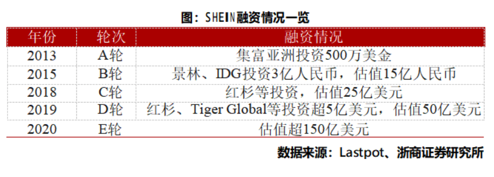 截止今年2月,SheIn 年活跃用户逾2000万,并在2020年完成E轮融资,估值超过150亿美元,今明年有望登陆美股。