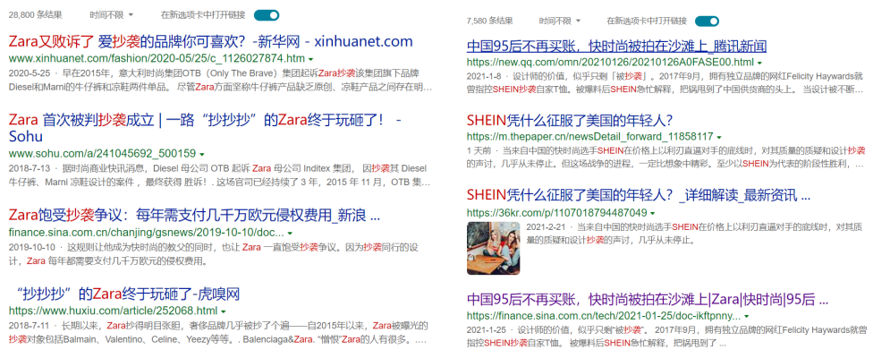图:Zara、Sheln 抄袭关键词搜索(资料来源:搜索引擎)
