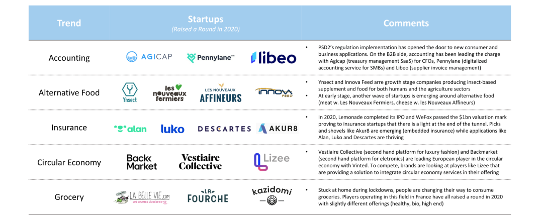日用杂货:因为疫情期间长时间被困在家里,人们的日用品消费方式正在改变。这一领域的法国玩家(健康、有机、高端产品类)在2020年都实现了一轮融资。