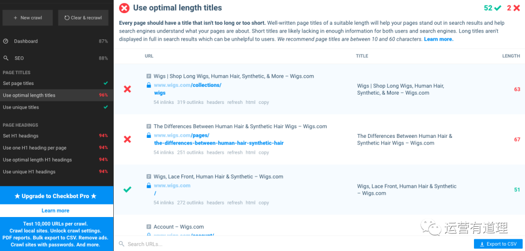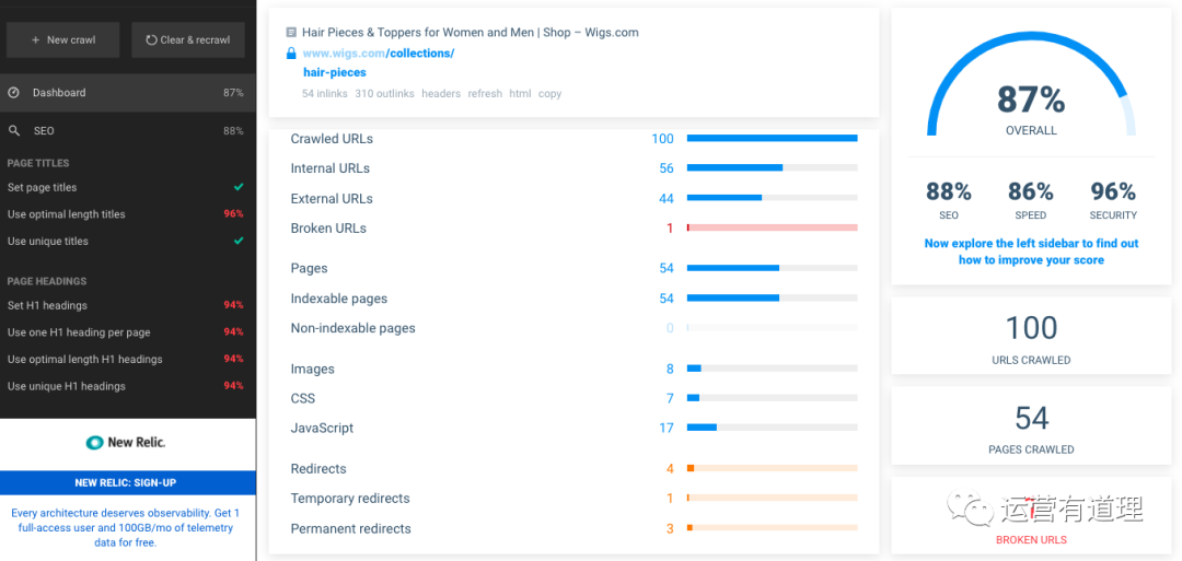 该工具,会从“SEO、加载速度和安全”3个大纬度,及50个常见小维度对网站的页面进行全面检测。