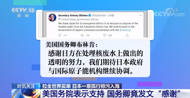 支持日本政府排污入海决定。美国国务卿布林肯甚至在社交媒体上“感谢”日本。