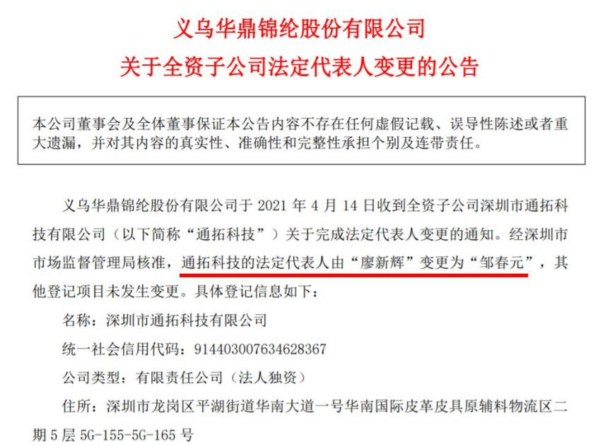 义乌华鼎锦纶股份有限公司于 2021 年 4 月 14 日收到全资子公司深圳市通拓科技有限公司(以下简称“通拓科技”)关于完成法定代表人变更的通知。经深圳市市场监督管理局核准,通拓科技的法定代表人由“廖新辉”变更为“邹春元”,其他登记项目未发生变更。